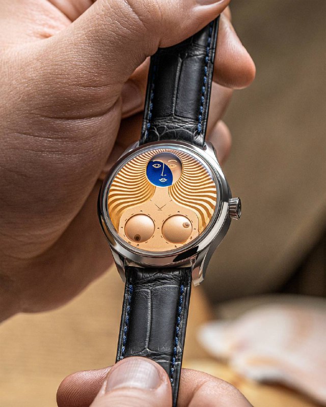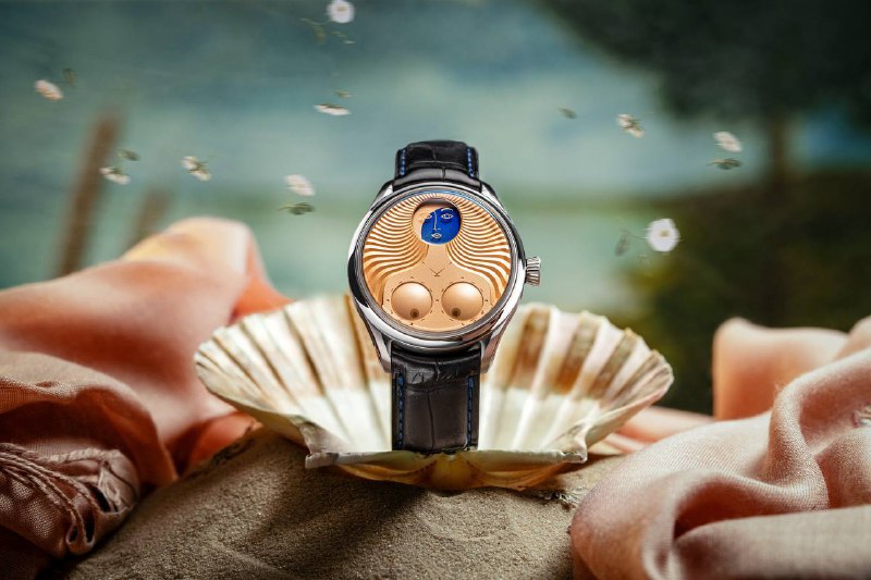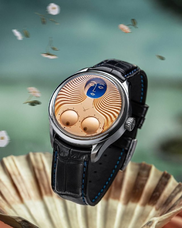 Фаза Луны превратилась в лицо богини, написанное минималистичными линиями в духе Пикассо, а весь циферблат стал самостоятельной композицией, вдохновлённой Рождением Венеры Боттичелли.
