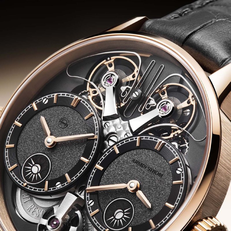 Одна из самых необычных моделей с двумя часовыми зонами - Armin Strom Dual Time GMT Resonance - вышла в новом материале. Часы, которые уже выпускались в белом золоте и стали, предстают в корпусе из розового золота. Удивительная гармония в дизайне и на уровне физики: здесь два циферблата (с часовой и минутными стрелками), два баланса и два спуска. Благодаря эффекту резонанса два балансовых колеса начинают вибрировать синхронно, но в противоположных направлениях, что минимизирует погрешности хода.