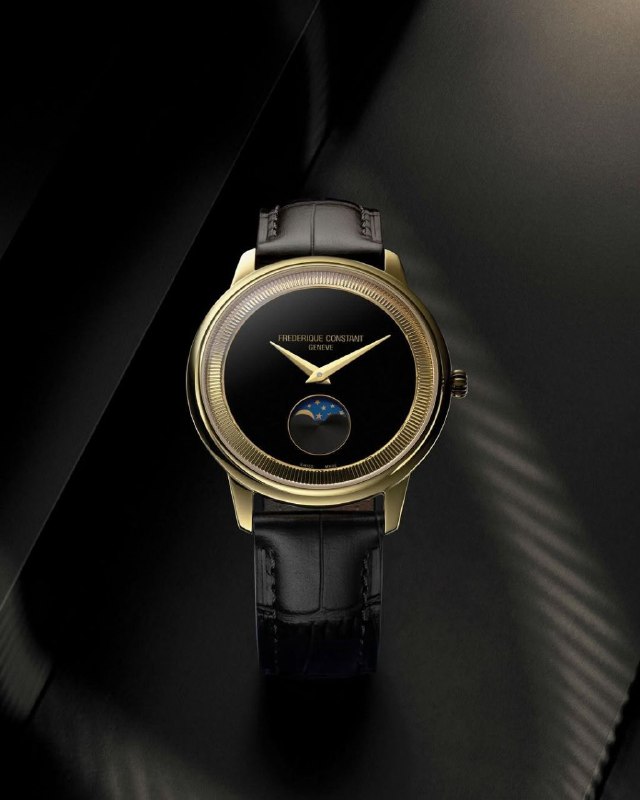 Сияющий золотой корпус, безупречно черный циферблат и луна, которая тихо плывет в положении шесть часов. Изящные линии, 37-миллиметровый корпус и золотистое сияние с любого ракурса. Представлены на Dubai Watch Week