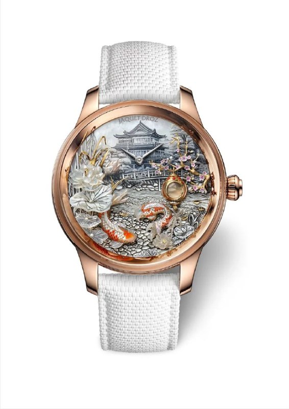 Jaquet Droz в своем репертуаре - наполненный деталями и сочетающий различные техники шедевр создали мастера на циферблате модели Petite Heure Minute Red Gold – Japanese Garden. Корпус из красного золота 41 мм обрамляет циферблат из перламутра. На нем - объемные объекты ручной работы, в том числе, скользящие под лилиями карпы кои с глазами-бриллиантами. Оснащаются часы автоматическим JD 2653 с запасом хода 68 часа.