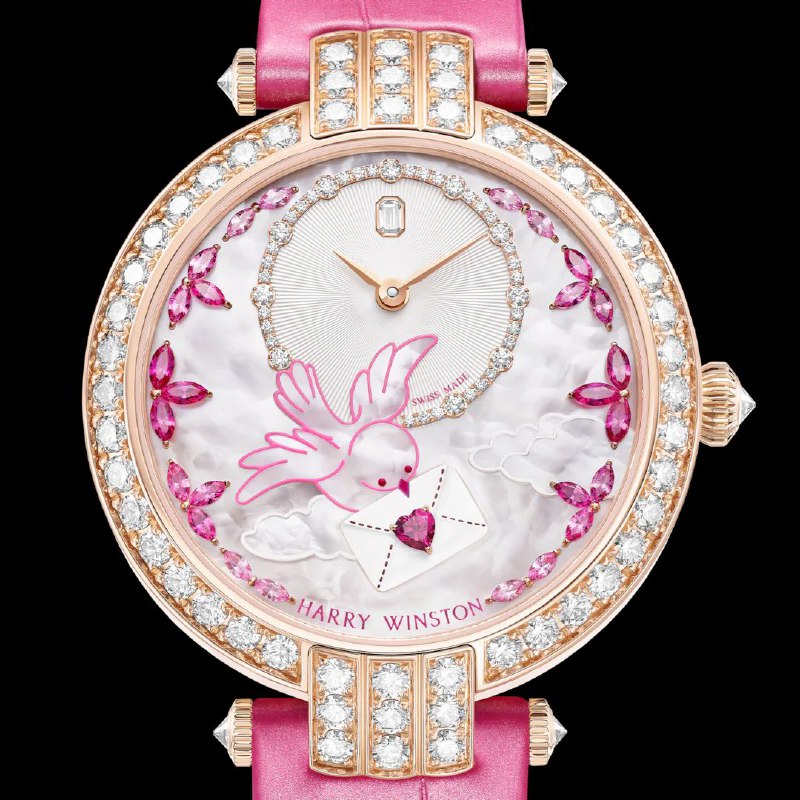 Валентинка от Harry Winston ("пишет" их ювелирно-часовой бренд с 2016-го) - Premier Valentine’s Day Automatic 36mm с перламутровым циферблатом и в корпусе из розового золота. В центре внимания - рубин в форме сердца. На "12" - бриллиант изумрудной огранки, 6 рубинов огранки «маркиз» на "3" и "9" окружены бутонами из розовых сапфиров с градиентным переходом цвета. Обрамлением циферблата с часовой и минутной стрелками служат 40 бриллиантов. Еще 57 камней украшают корпус. Внутри - автоматический механизм с запасом хода 68 часов.