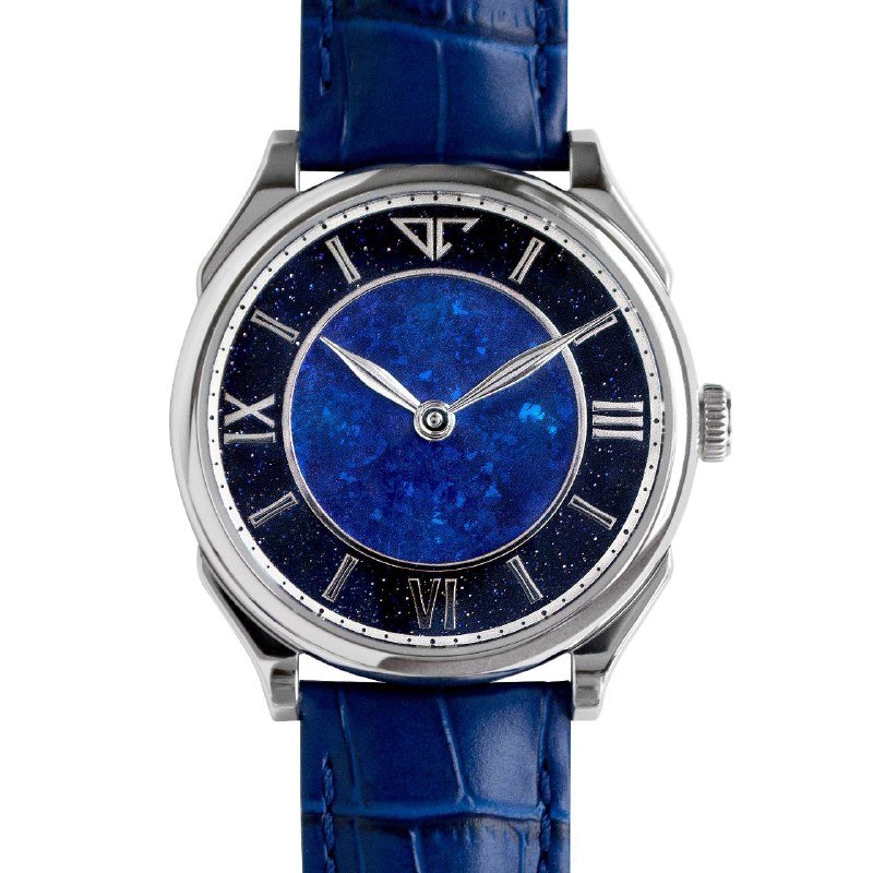 Циферблат – синяя лакированная «тарелка» с белыми римскими цифрами и бриллиантово‑полированными стальными стрелками, которые ярко ловят свет.