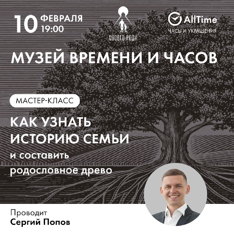 Тема, которая обязана была прозвучать в стенах Музея Времени и Часов! Мы рады пригласить вас 10 февраля (вторник) на мастер-класс «Как узнать историю семьи и составить родословное древо».