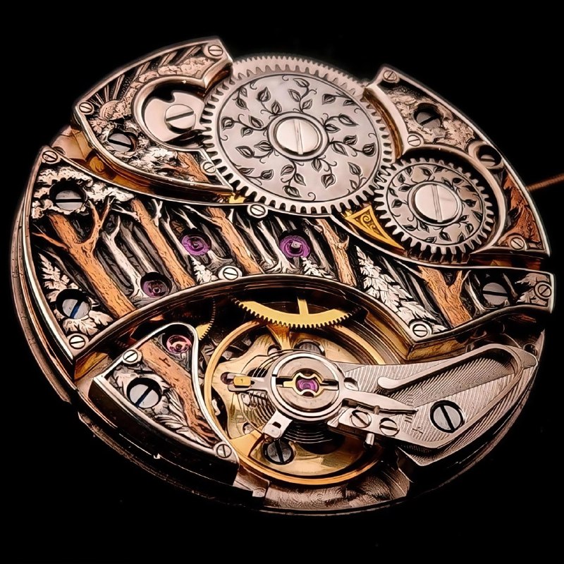 Внутри установлен калибр MS-JH-01 на базе Sellita SW300 с дополнительным модулем прыгающего часа. Через прозрачную заднюю крышку виден ротор, стилизованный под три переплетённые ферматы.