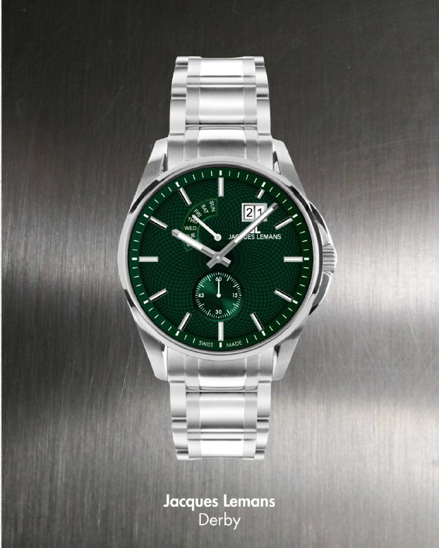 Главный акцент — полностью CVD-покрытый циферблат глубокого зелёного цвета, меняющего оттенок от зелёного к синему в зависимости от освещения. Компоновка включает 12-часовой счётчик на 6 часах, малую секунду на 9 и 30-минутный счётчик на 12. На 3 часах расположен указатель фаз Луны, а дата вынесена на периферию и отображается центральной стрелкой с фиолетовым наконечником в форме полумесяца.
