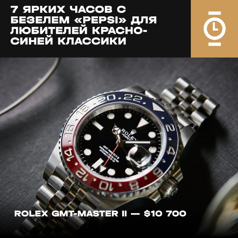 Красно-синий безель стал одной из самых узнаваемых цветовых схем в мире часов. Этот стиль родился в 1954 году, когда Pan Am заказала у Rolex модель для пилотов, позволяющую отслеживать два часовых пояса. Так появился GMT-Master, а его красно-синяя вставка получила народное имя «Pepsi». Сегодня такой безель встречается и на GMT-моделях, и на дайверах, и просто на эффектных повседневных часах.
