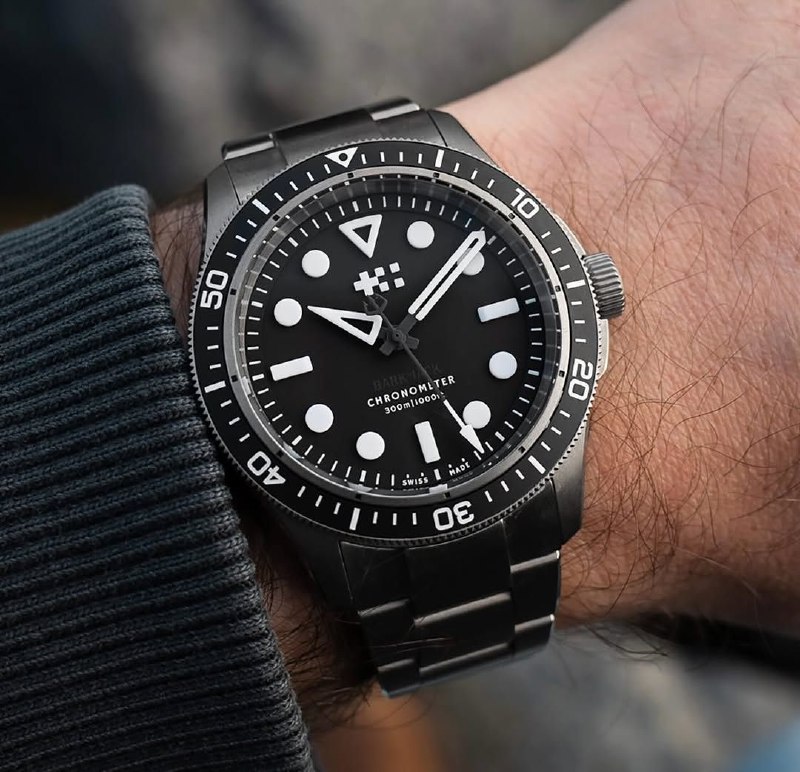 • Внутри — модифицированный автоматический калибр Sellita SW330‑1: вместо классической GMT‑стрелки используется вращающийся 24‑часовой диск.