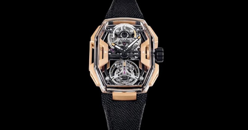 Корпус из титана Grade 5, футуристическая архитектура и механика, которая действительно оживает: по нажатию кнопки два пружинных механизма поднимают весь модуль часов вертикально, открывая индикацию часов и минут, а вместе с ней — ручной калибр, что задаёт всему этому движение.