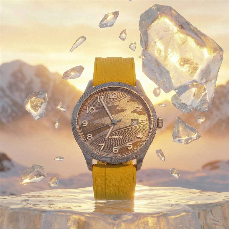 Циферблат выполнен из дамасского титана — материала, сформированного из перекрученных и кованых слоёв титана, без применения краски. Рисунок задаётся самой структурой металла и отсылает к напластованиям и разломам ледника, подсвеченным утренним светом. Остальные характеристики модели остаются едиными для всей серии Актру: автоматический механизм, сапфировое стекло и универсальный корпус, рассчитанный на ежедневное использование