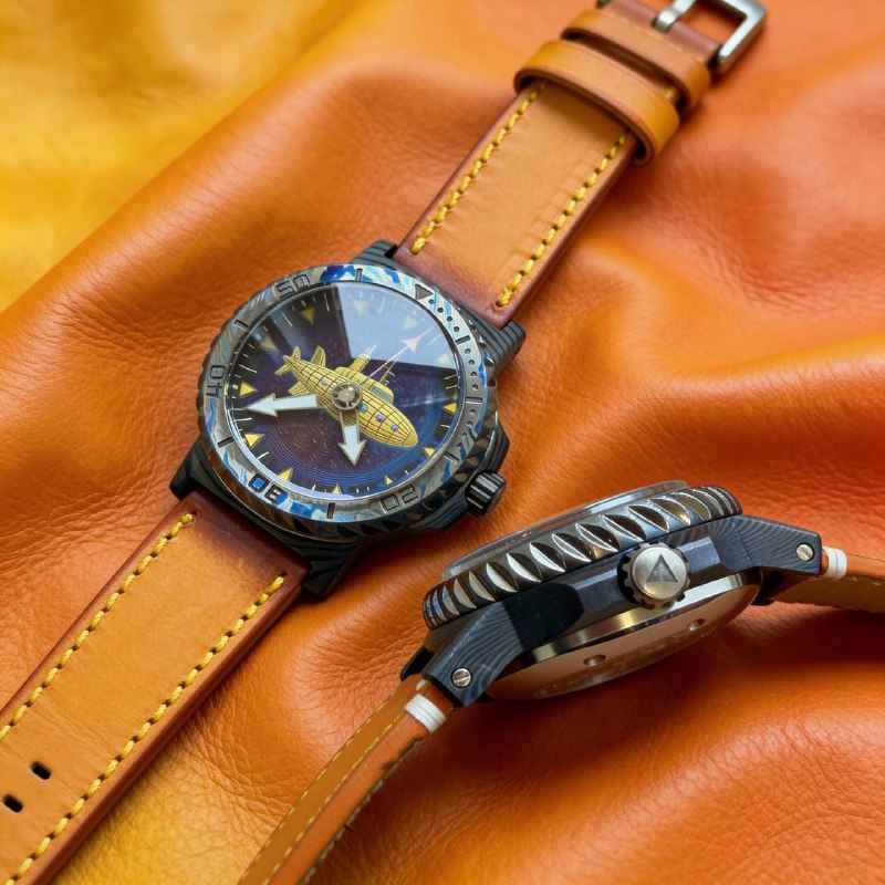 Корпус выполнен из титанового дамаска (тимаскус). Объёмная форма «субмарины» задаёт образ и ощущение массивности, а узор металла формируется вручную, поэтому каждый экземпляр получается уникальным. Здесь важен не только результат, но и сам процесс — ручная работа с материалом, сборкой и доводкой каждой детали.
