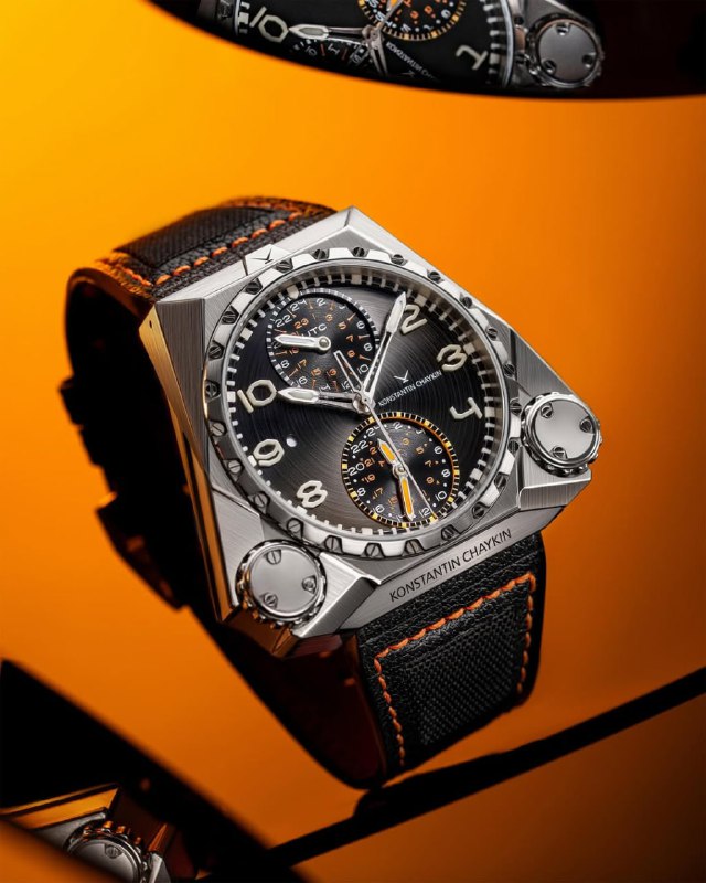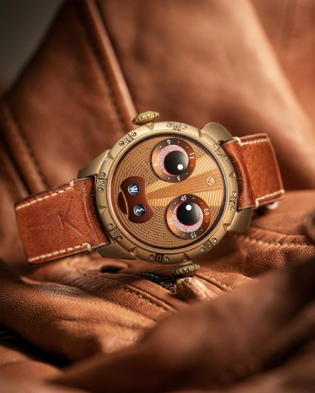 В трапециевидный силуэт вписан безель на 24 винтах, напоминающий шлюз стыковочной системы корабля. Слово «Файтер» также появилось в названии неслучайно: оно делает упор на авиационный стиль часов с уникальным ремонтуаром, располагающим сразу двумя вертикальными головками. Эти часы отображают локальное земное время, второй часовой пояс (UTC) и марсианское время (MCT), при этом логика управления остается подчеркнуто инструментальной.