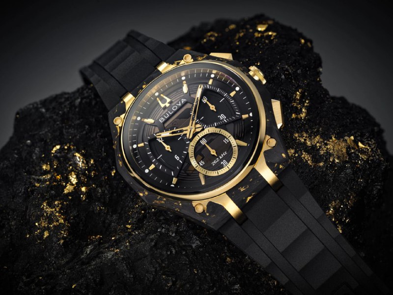 Bulova представила смелейшую версию CURV — корпус из сверхпрочного кованого карбона с микроскопическими чешуйками чистого золота (97.97%) для неповторимого блеска. Золотистый безель из стали с видимыми винтами усиливает контраст.