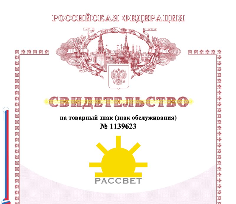 Рады сообщить, что наша торговая марка «Рассвет» успешно прошла регистрацию в Федеральной службе интеллектуальной собственности (Роспатент), получив официальный статус на территории Российской Федерации. Это событие подтверждает уникальность бренда и обеспечивает надёжную правовую защиту нашего товарного знака.