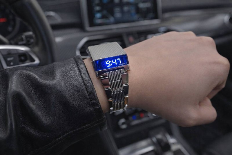 У меня сегодня — Bulova Computron. Архивное LED-переиздание 1976 года: трапециевидный корпус с вертикальными каннелюрами, синий дисплей с ручной активацией и предельно лаконичный функционал — время, дата, второй пояс.