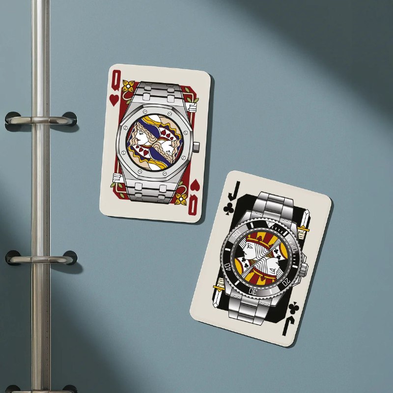 Игральные карты "Угадай часы с первого раза" - дизайнер Аксель Малка с прошлым в March LAB собрал деньги на платформе Kickstarter и выпустил игральные карты для любителей часов. 52 карты из колоды Steel Watches украшены изображениями, где карточные фигуры вписаны в корпуса легендарных моделей. Цена вопроса - 18 евро.