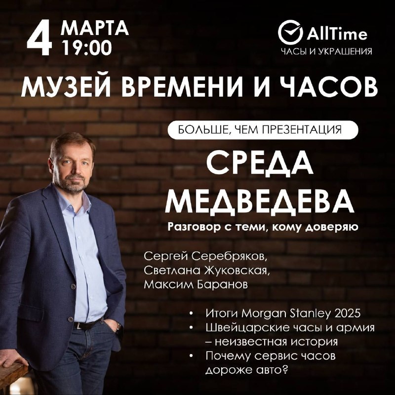 Музей Времени и Часов напоминает о том, что завтра, 4 марта (среда), в 19:00 состоится встреча «Среда Медведева»: больше, чем просто презентация!