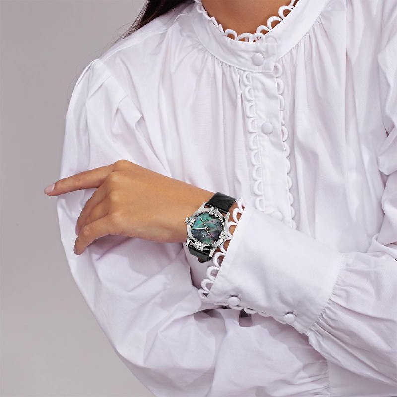 Невероятные узоры черного перламутра заполняют весь циферблат. Римские цифры, усыпанные фианитами, переместились на серебряный корпус.