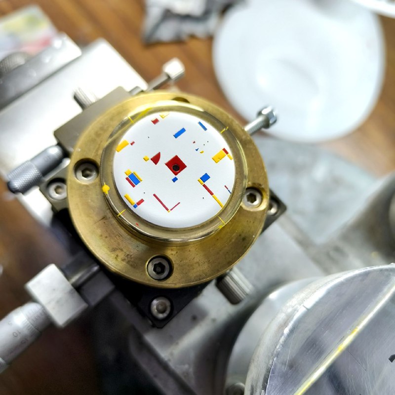Продолжаем знакомить вас с фото- и видеозарисовками нашего «производственного закулисья». На первом кадре можно рассмотреть один из этапов сборки корпуса. Следующая фотография показывает процесс работы на токарном станке. Два видео в нижнем ряду – это финишная операция (зенковка моста для калибра новой модели, которую мы представим в этом году) и установка съемной части оснастки в держатель на фрезерном участке. А между ними – готовые к установке в корпус заводные головки.