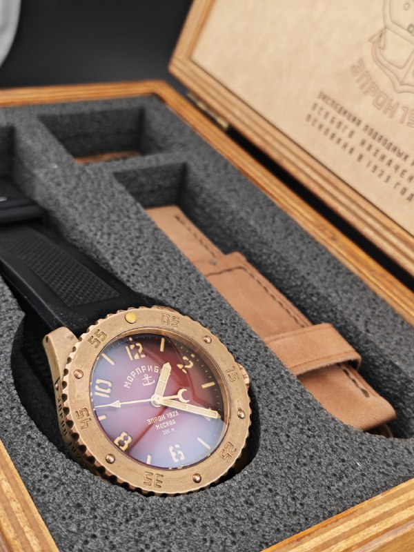 Добрый день, друзья! Время летит, захотелось обновить свои часы. Сам я тот ещё коллекционер, может и хотел бы, но пока все в семью, а красоту только для вас. Тем не менее, решил расстаться со своим Морприбором Москва под №50, а так же первыми часами супруги (сменила на Алтай Мувмент) - кастом на базе первого официально проданного в день презентации в РФ Луча однострелочника. Морприбор идет на сменном комплектном ремне и с новым ремнем от Антона на замену. Луч это мой ранний кастом с циферблатом акриловой миниатюрой работы Татьяны Любимовой, заднее стекло заменено на натуральный камень Янтарного цвета с ручной инталией в виде снежинок. Ремешок ручной работы ещё на 1 сезон минимум. На коробке автограф известного человека ответственного за появление Луча официально в РФ. (https://t.me/morzowatches/269?single)