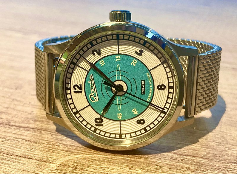 Хотим показать, как выглядят часы «Эфир. Бирюза» на браслете миланского плетения толщиной 3 мм. При заказе часов этот браслет можно бесплатно получить вместе с комплектным чёрным ремешком. Вместо браслета можно выбрать фирменный винтажный напульсник.