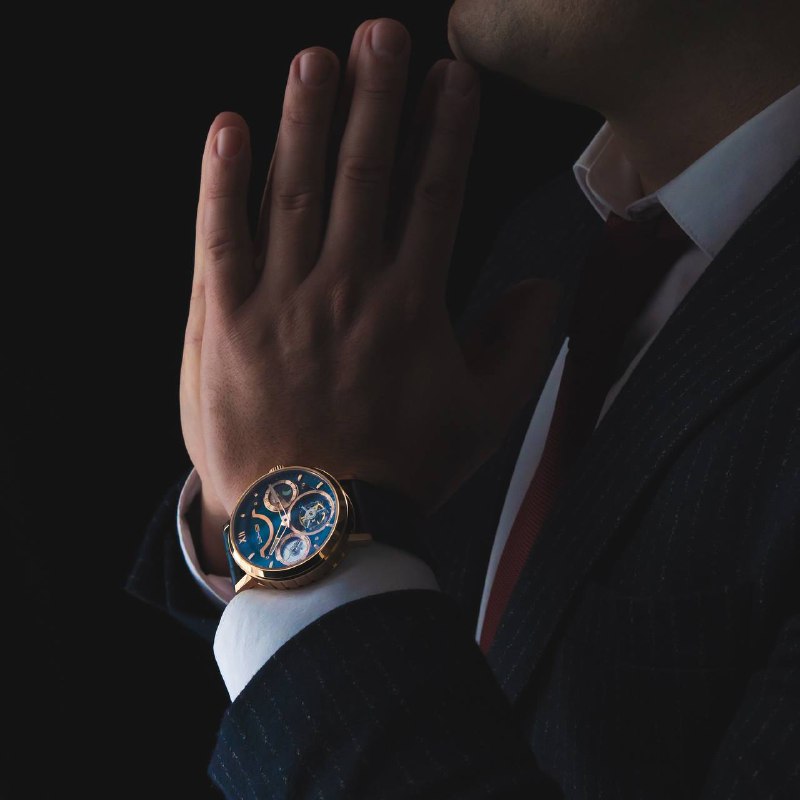 Эта модель сочетает сложную механику, премиальные материалы и безупречный дизайн. Корпус из нержавеющей стали 316L диаметром 42.5 мм с зеркальной полировкой и сатинированием создает эффектную игру света.