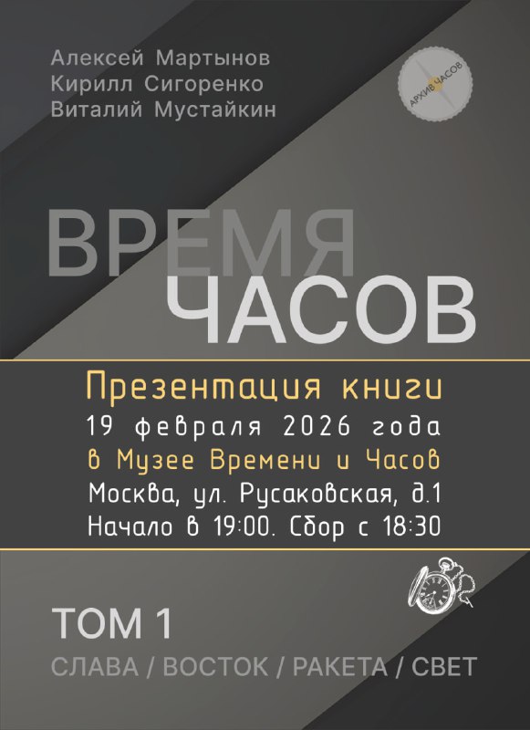 Приглашаем Вас на презентацию книги «ВРЕМЯ ЧАСОВ». Мероприятие пройдёт 19 февраля в Музее Времени и Часов. Начало сбора гостей запланировано на 18:30, начало самой презентации — в 19:00.